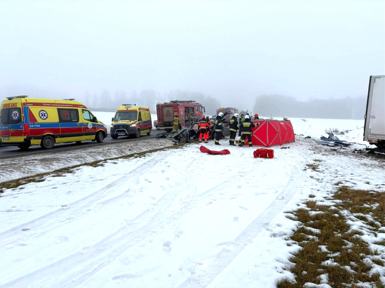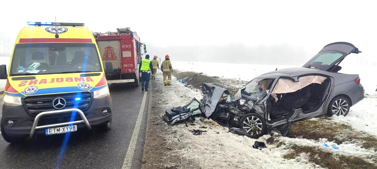 Jedna z osób była uwięziona w pojeździe, do którego dostęp uzyskali strażacy i ewakuowali ją z wraku. Droga w miejscu zdarzenia jest całkowicie zablokowana.