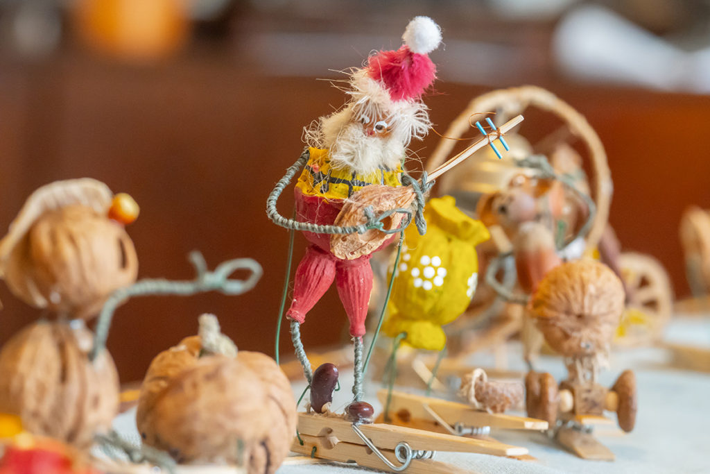 Bazą do wykonania tych niezwykłych, mikroskopijnych ozdób są tylko naturalne materiały: łupiny orzechów, żołędzie, główki makówek, kawałki drewna, traw, kora, mech, ziarnka zbóż. Jak mówi sam artysta, wykorzystuje to, co innym może wydawać się bezwartościowe. Jego pracownia to prawdziwy magazyn m.in. łupinek po orzechach włoskich, które ma w swoim ogrodzie, ale i które przynoszą mu ludzie. Pan Mariusz potrafi z nich wyczarować praktycznie wszystko – orzech może być dzikiem, pszczółką Mają, konikiem na biegunach, brzuchem Mikołaja, kulami bałwanka czy wózkiem dla malutkiej małpki. Każda ozdoba zachwyca precyzją wykonania i niewiarygodną fantazją autora. Figurki grają na instrumentach, wspinają się po linach, jeżdżą na wózeczkach.