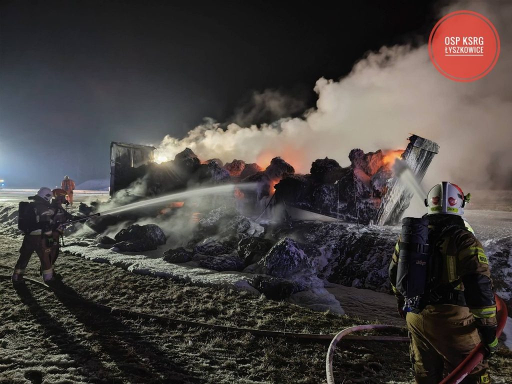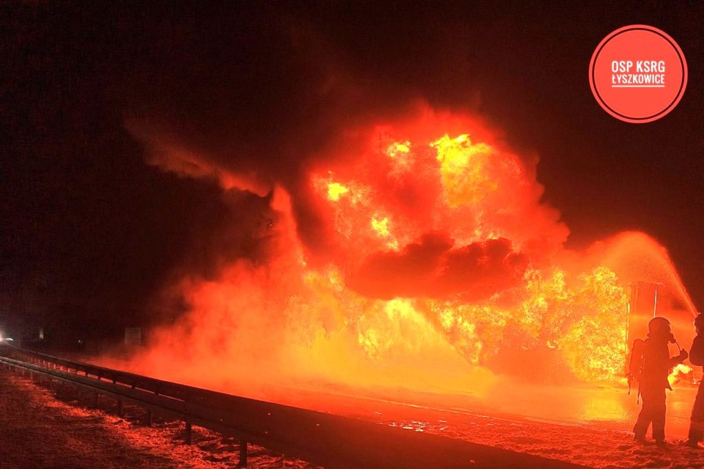 Na godzinę 00:12 ruch w kierunku Warszawy jest całkowicie zablokowany. Utrudnienia mogą potrwać jeszcze kilka godzin, do czasu wygaszenia ładunku, odholowania uszkodzonej naczepy oraz naprawy uszkodzonej infrastruktury drogowej. Ruch w kierunku Poznania odbywa się jednym pasem. Na miejscu działają zastępy z OSP KSRG Łyszkowice, OSP KSRG Kalenice, JRG Łowicz, JRG Łódź”.