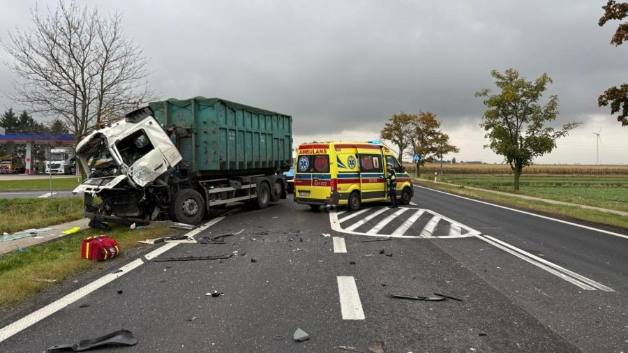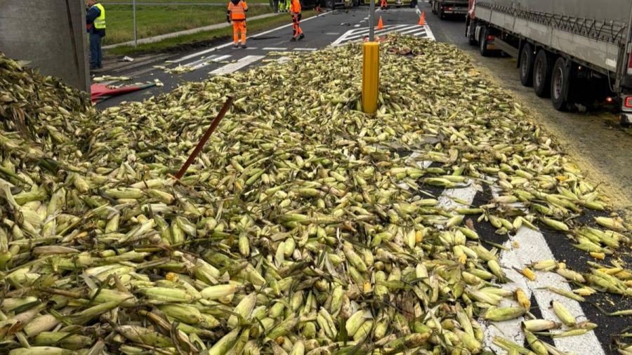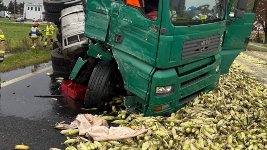 Zderzenie ciężarówek! Ranny kierowca, kukurydza na drodze!