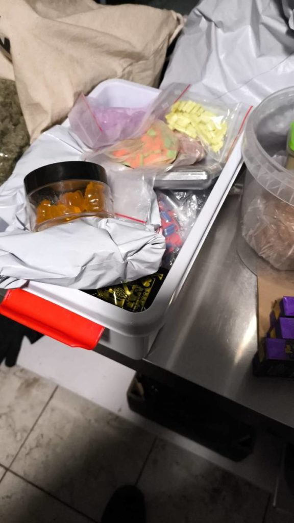 W jego miejscu pracy policjanci natrafili na prawdziwy narkotykowy arsenał. Zabezpieczono tam liczne torby foliowe z suszem roślinnym – łącznie prawie pół kilograma marihuany – a także torbę z ciemną masą plastyczną, ciastka i żelki z THC, grzyby halucynogenne oraz różnego rodzaju sproszkowane substancje, tabletki MDMA, 3 wagi elektroniczne, 46 e-papierosów z olejkami THC oraz słoik z olejkiem THC. Ponadto policjanci zabezpieczyli tam również grzybnię, która prawdopodobnie miała służyć do uprawy grzybów halucynogennych. Wstępne badania zabezpieczonych środków testerami narkotykowymi potwierdziły obecność m.in. kokainy, amfetaminy oraz MDMA.